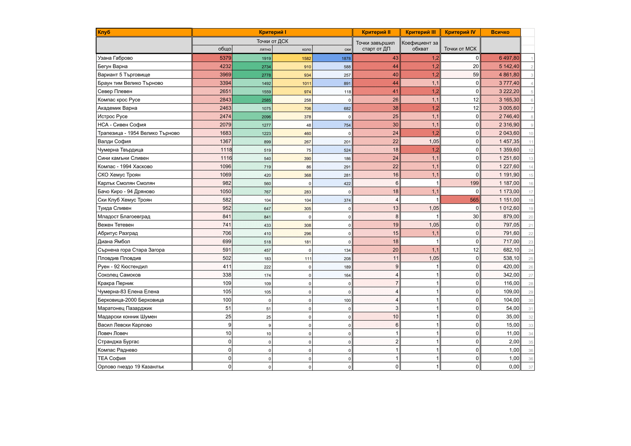 В лятното ориентиране, което доминира у нас, на върха е Вариант 5 с 2778 точки, само с няколко повече от тези на Бегун Варна. Третата позиция е за Компас Крос Русе. Още само един клуб има над 2000 точки и това е Истрос Русе.